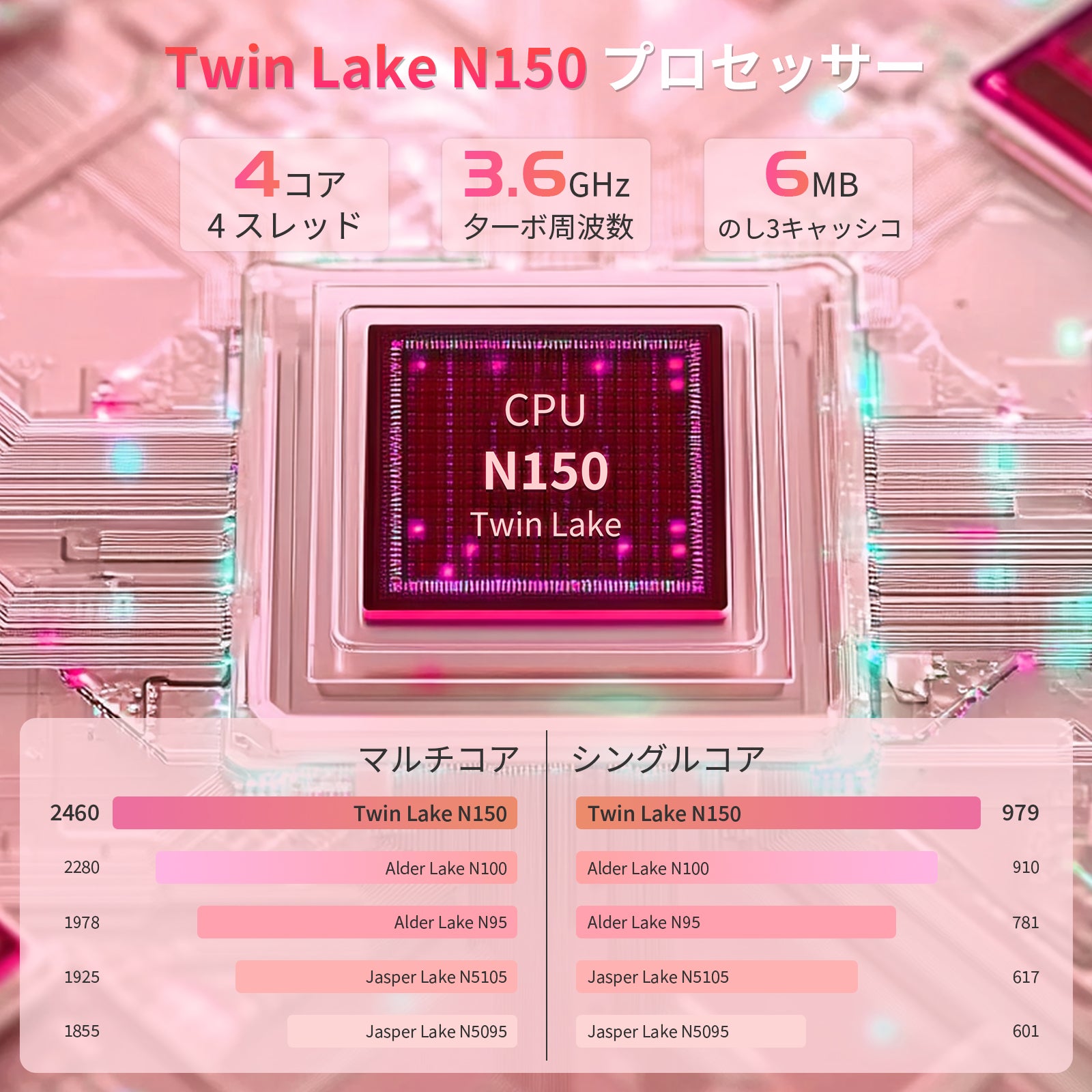 【Twin Lake-N150 プロセッサ搭載】4コア4スレッドのTwin Lake-N150 プロセッサを搭載し、処理性能はインテル N100より約15%上がり、遅延のないスムーズな操作を実現、日常の作業やエンターテイメントに最適な性能を発揮します。最大3.60GHzのターボブースト機能により、高速処理でスムーズな操作を実現しながら、発熱もちゃんと抑える高回転速の静音冷却フアンも搭載されているため、過熱によるパソコンの動作遅延(ラグ)やブルースクリーンエラー、さらにはシャットダウンが発生するリスクが前世代より大幅に低減しました。また、15Wの低消費電力設計で、効率的な電力使用と長時間の使用をサポートします